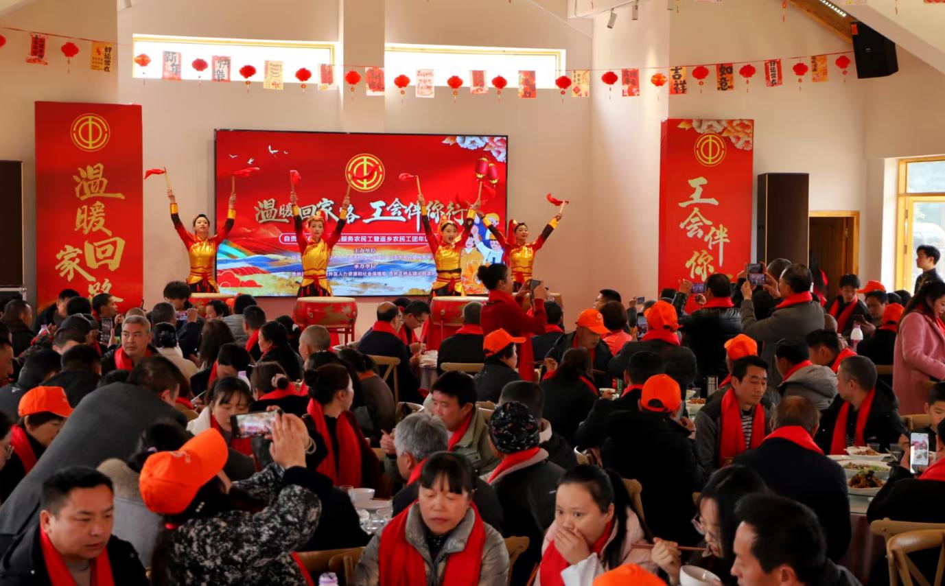 自贡市贡井区桥头镇四月阳光农场广场上年味浓郁、欢声阵阵。以“温暖回家路,工会伴你行”为主题的关爱服务农民工暨返乡农民工团年饭活动在此举行。