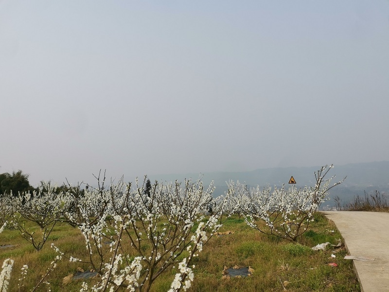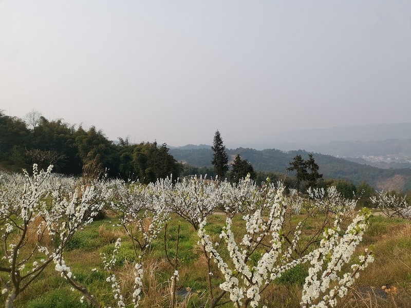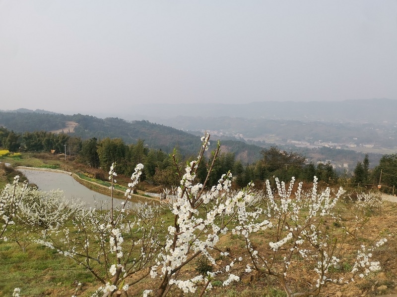 杨家村李子基地位于杨家山顶,从山上遥望兜山镇景貌,令人心旷神怡。站在山间往上看,白白的李花竞相绽放,顺着山势,自然而有层次,远远望去,就像皑皑白雪覆盖整个山间,和青山交相辉映。