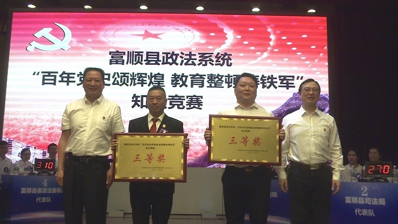 据悉,本次知识竞赛共有富顺县人民检察院、县司法局、县人民法院、县委政法委机关、县公安局五只队伍参赛。比赛共分为必答题、抢答题、风险抢答题三个环节。各队伍参赛选手沉着冷静,对答如流,各方你追我赶,相互之间毫不示弱,充分展现政法系统工作人员扎实的政治理论功底。经过一系列的精彩角逐,最终,该县人民检察院代表队以330分的优异成绩夺得本次“百年党史铸辉煌 教育整顿铸铁军”知识竞赛的第一名,县委政法委机关代表队和县公安局代表队获得第二名,县人民法院和县司法局获得第三名。在场领导分别上台为他们颁奖并合影留念。