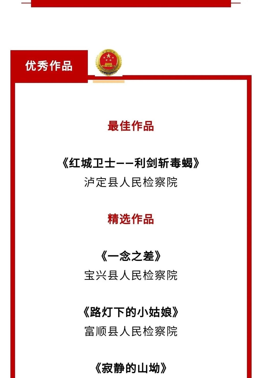 其中,富顺县人民检察院选送的原创禁毒宣传作品《路灯下的小姑娘》(禁毒版)荣获精选作品,并在四川检察微信公众号进行展播。据悉,该院先后获“全省禁毒严打整治行动成绩突出集体”荣誉称号、“自贡市2018-2020年禁毒人民战争先进集体”称号。荣誉的背后,是多年来积极参与禁毒人民战争的坚守。