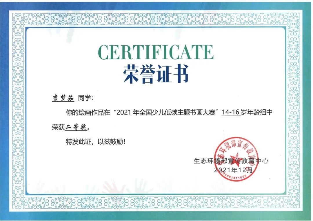 比赛分书法和绘画2个类别共10个年龄组,该校组织学生参加绘画类14-16岁组的比赛,本组共设一等奖3名,二等奖5名,三等奖10名。该校参赛学生程曦蓓、李梦茹分别获得一等奖、二等奖。