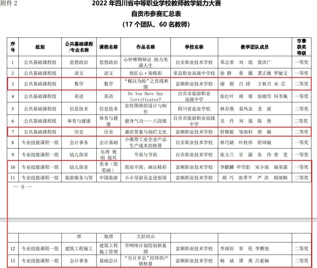 4月29日,2022年自贡市中等职业学校教师教学能力大赛决赛结果公布,富顺职业技术学校获一等奖 1 项、二等奖 7 项、三等奖 6 项,6 个教学团队入围省赛,获奖数量、入围省赛数量均列全市第一。