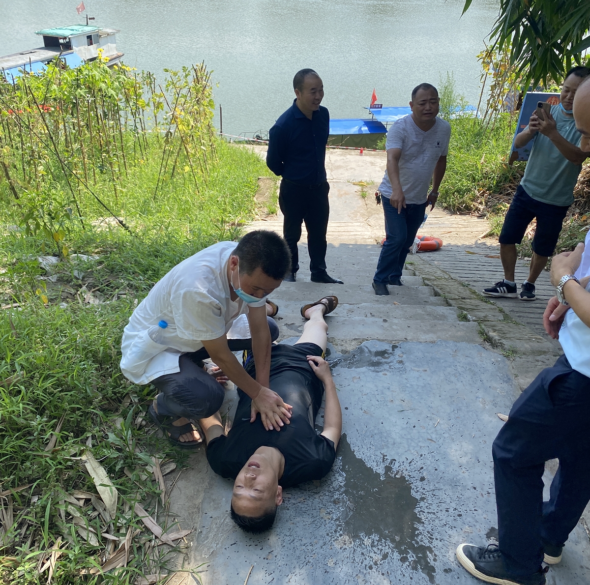 在安溪渡口,一名工作人员扮演落水人员,另一名扮演救援人员,救援人员发现落水人员后立即开展救援,救援中主要演示救生衣的穿着、救生圈和救援杆的正确使用方式;救上岸后由镇卫生院工作人员演示现场紧急救援,主要是对溺水者进行检查以及心肺复苏的正确方式。
