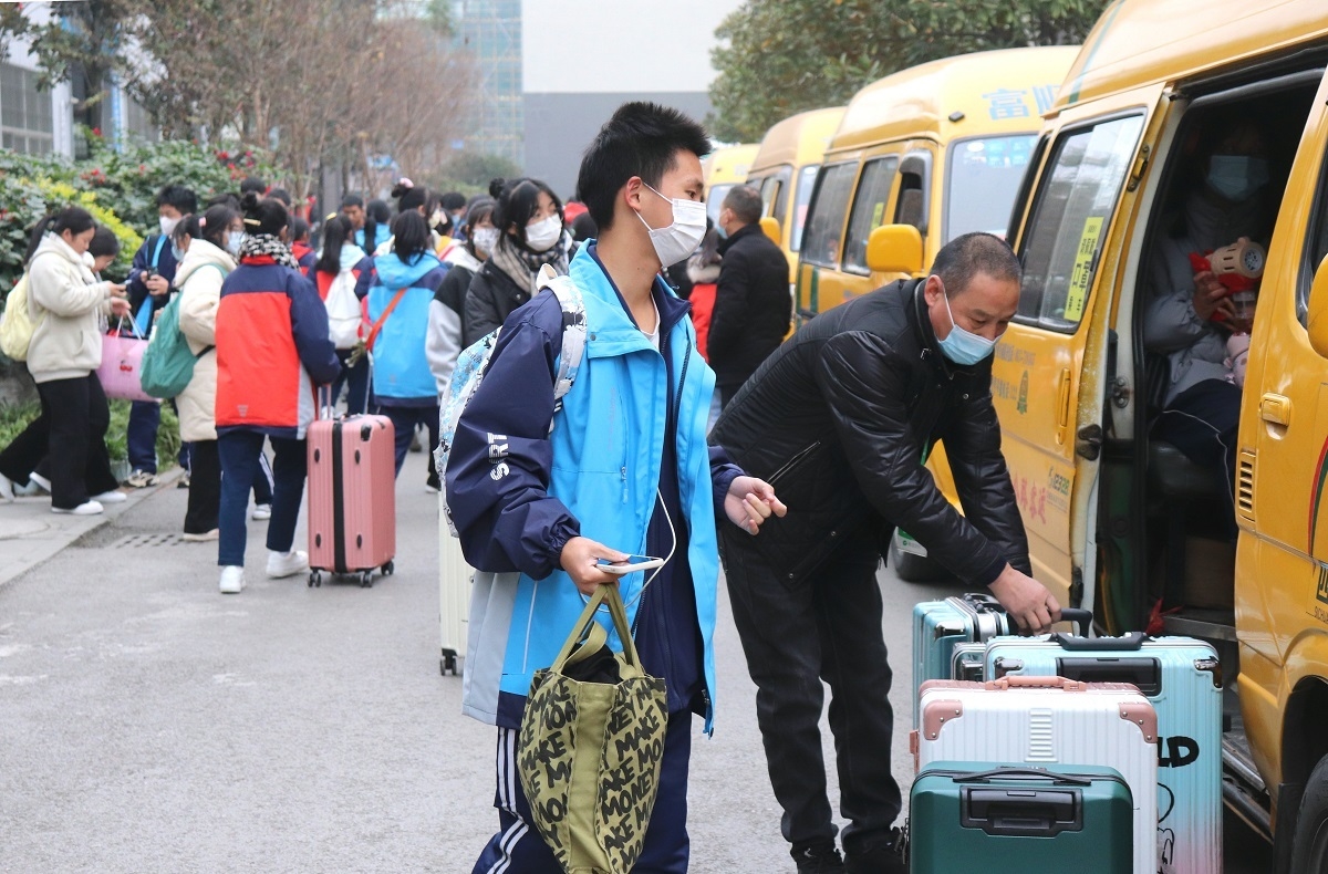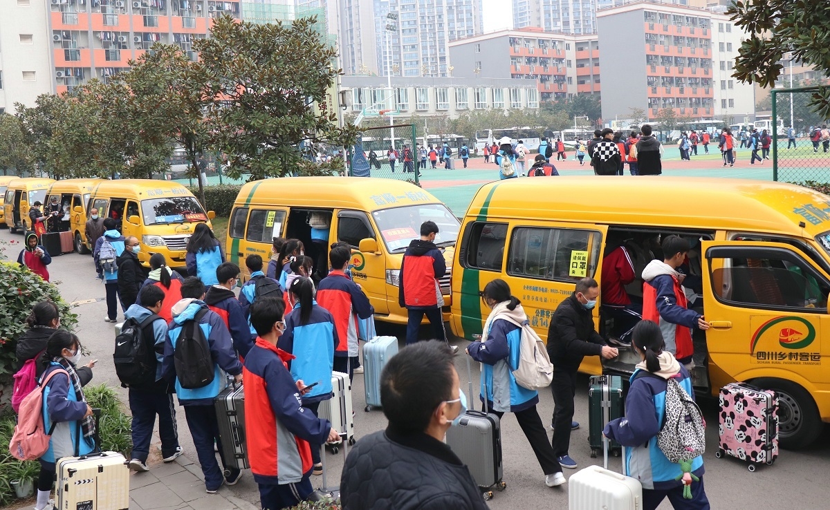 12月9日,富顺县职校操场周边,来自于怀德、赵化等乡镇的各型客运车有序排起长队,专程等待各沿线住校学生放学回家。