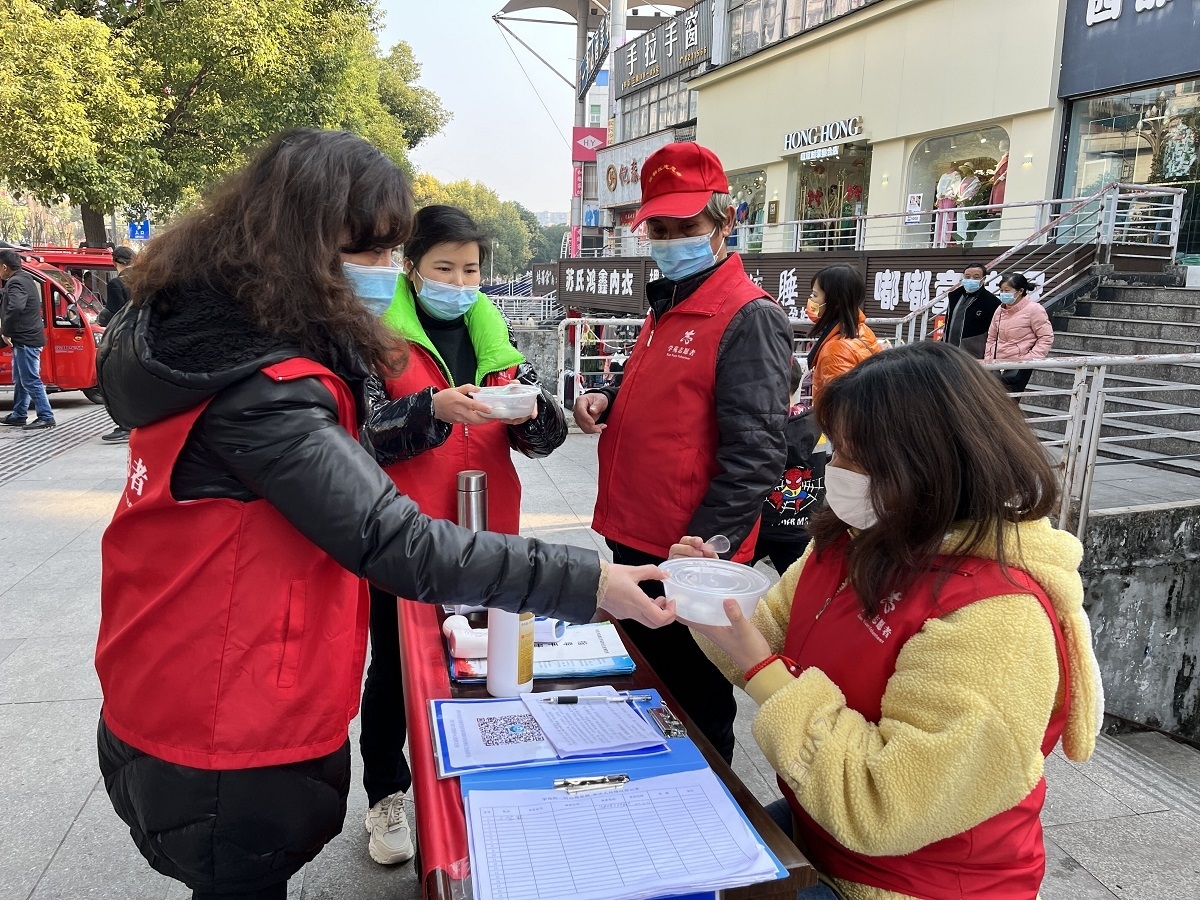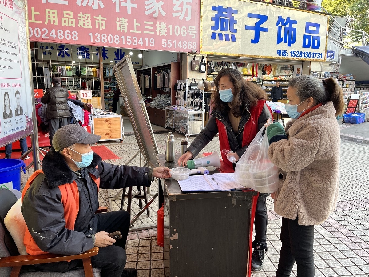 春节期间,谢家坝社区一群党员自告奋勇承担起一对山批发市场疫情防控的服务工作。在元宵节这天,社区党委成员还将分装在餐盒里的汤圆,为社区各防控点的志愿者者们送上一份温暖。