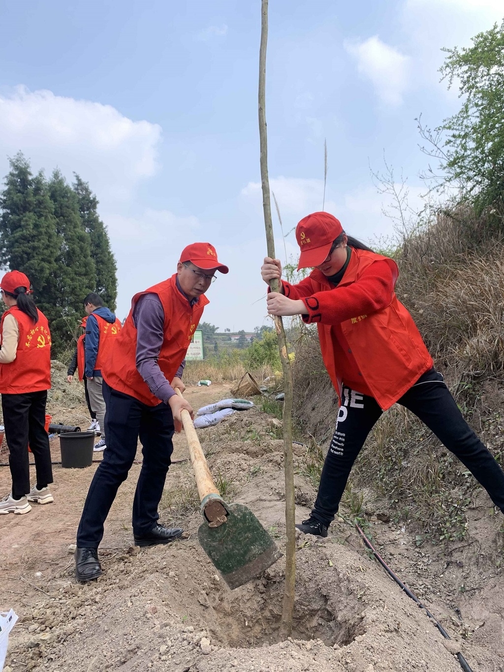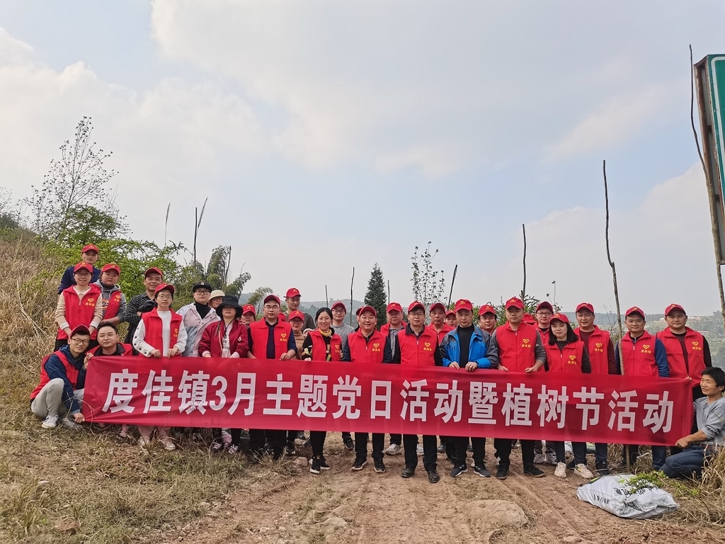 在度佳镇撞钟坝村植树现场,广大党员干部职工身穿红色小马甲精神饱满、热情高涨,大家合理分工、密切协作,有的挥锨铲土、有的提苗踩实、有的用水浇灌,认真的完成植树的每一道工序,精心栽下一棵又一棵树苗,一副生机勃勃的画卷跃然纸上。