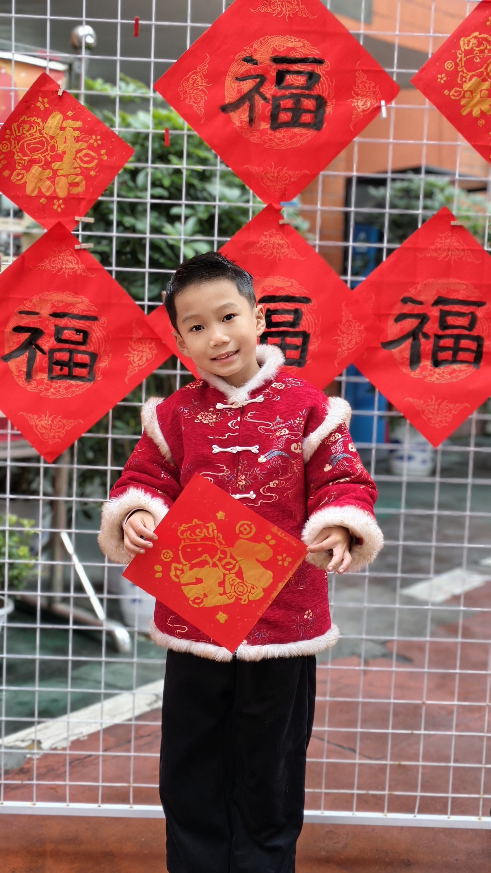 三年级的“百福墙”则是一片红色的海洋。同学们围绕“福”字展开创作,通过多种字体书写出形态各异的“福”字,汇聚成寓意吉祥的“百福墙”。