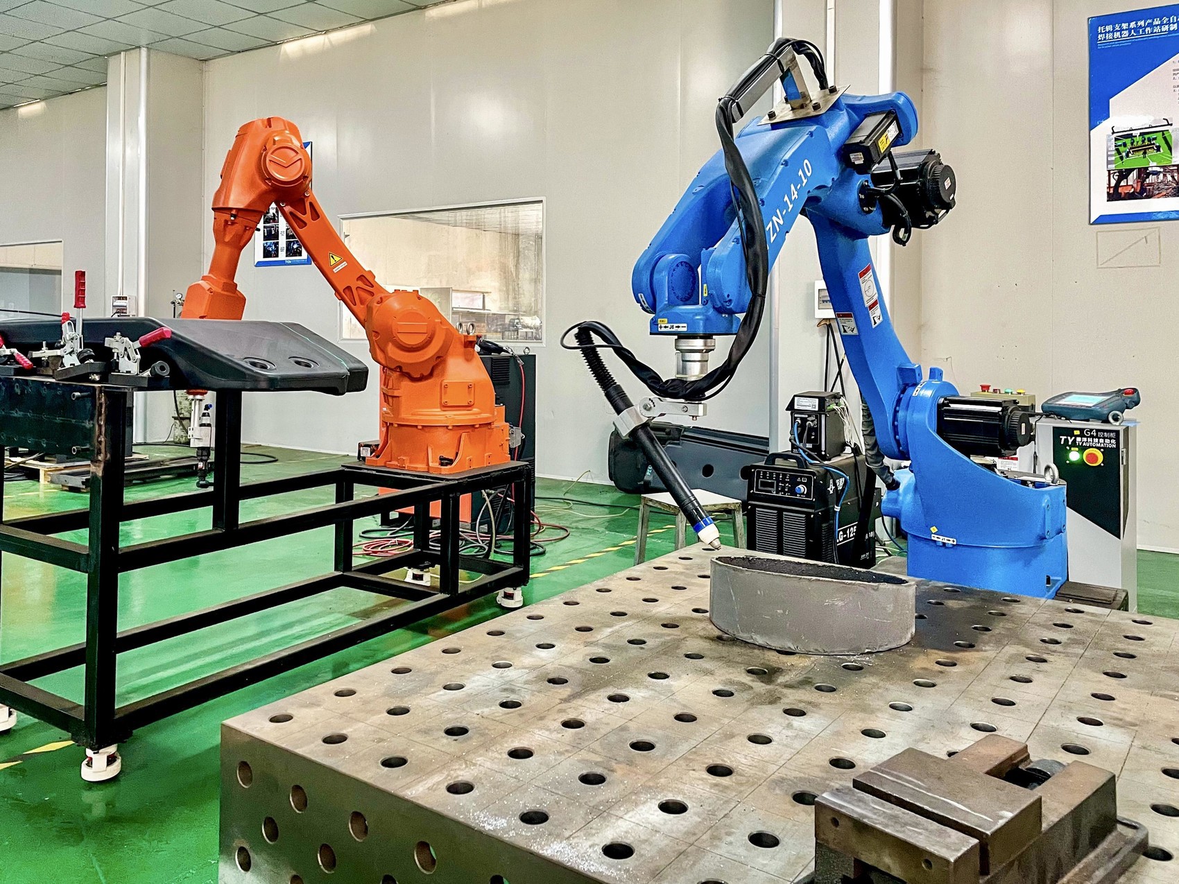 四川滕洋智能科技有限公司智能化机器正进行切割与打磨作业。