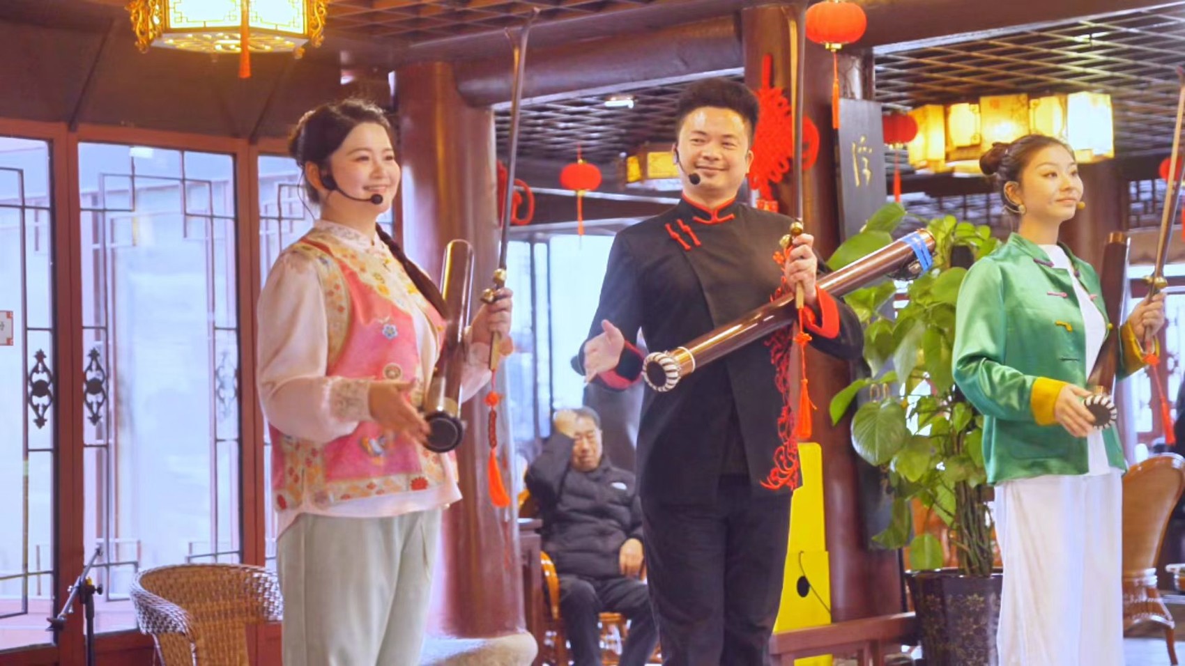不远处的王爷庙则传来阵阵悠扬的曲乐。曲艺打击乐《燊海传奇》气势磅礴,敲响了=千年盐都的豪迈;曲艺串烧《盐韵芳华》婉转悠扬,尽显本土风情。盘子《春风送暖》清脆悦耳,竹琴《寻味》韵味悠长——传统曲艺在古戏台上轮番上演,台下座无虚席,叫好声不绝于耳。