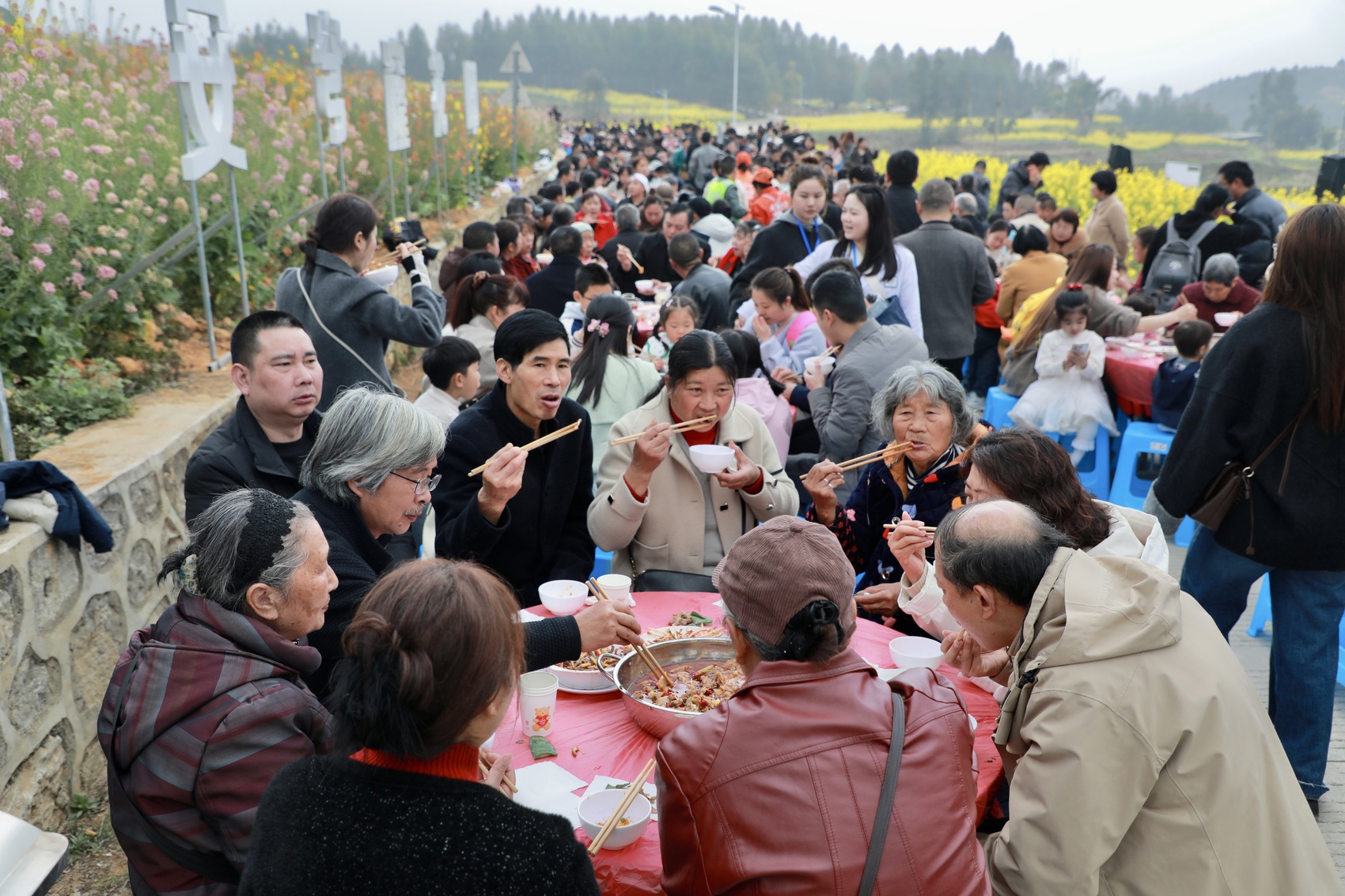 花田主舞台上,“春暖田间·花满人间”乡村文旅文艺展演火热开演,歌舞、民俗节目轮番上阵。现场还有玩偶NPC趣味互动,趣味拓印区、农特产品展销区、特色小吃区。与此同时,“花田飨宴・千人同春” 千人坝坝宴、“竹篱呼伴・田垄竞逐” 趣味捉鸡套鸭、“竹架摇春・凫趣争先” 水田抓鸭等活动依次开展,乡土趣味十足。
