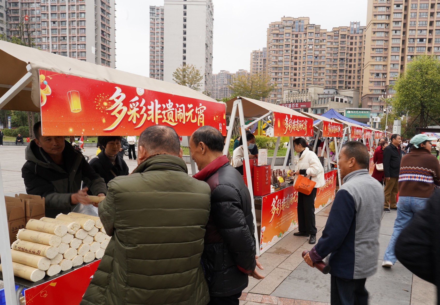 下午2时,富顺县文体中心广场上人头攒动。来自富顺的各项非遗布局在舞台两侧,20个非遗展示展销摊位一字排开,迎候着市民与游客,糖画、篆香、玻璃吹塑、传统酿酒等非遗齐聚一堂。市民游客穿梭于摊位之间,或驻足观赏技艺,或挑选心仪好物。展演彩排活动页有条不紊地推进。