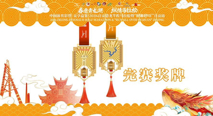 值得一提的是,赛事特邀川超自贡灯城燊龙队队长朱涛担任代言人,自贡籍田径名将吴艳妮担任赛事推荐官,为家乡赛事助阵。发布会上,本届赛事奖牌、参赛服正式亮相,奖牌融入彩灯、燊海井、青龙湖、紫薇花等自贡特色元素,参赛服以活力红为主色调,融合城市地标、灯会及青龙湖赛道轮廓设计,尽显地域文化特色。