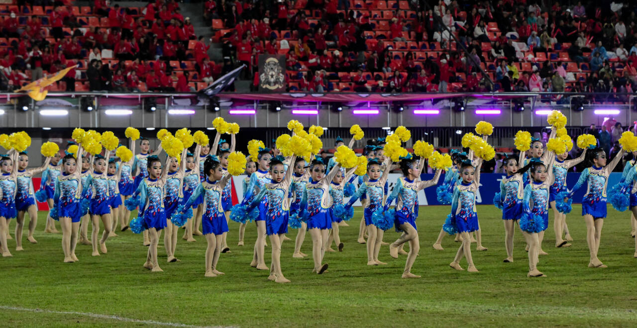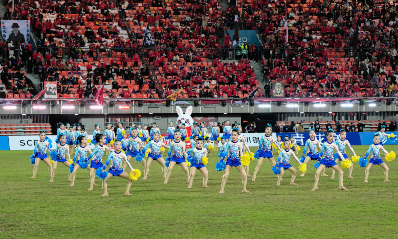 3月14日晚,2025—2026赛季四川省城市足球联赛(川超)自贡主场赛事在南湖体育中心火热进行。中场休息时分,自贡市汇东实验学校280名啦啦操队员闪亮登场,以激情洋溢的《啦啦之星》表演点燃全场热情。