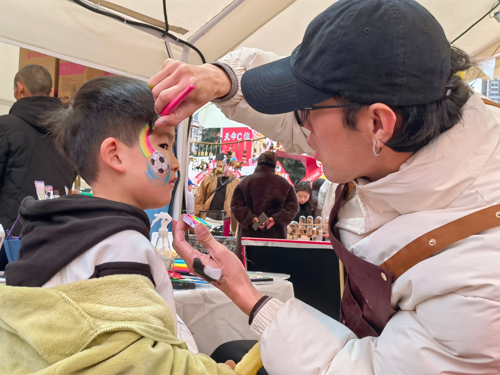 摊主粟炜炜正在给小朋友画脸绘。