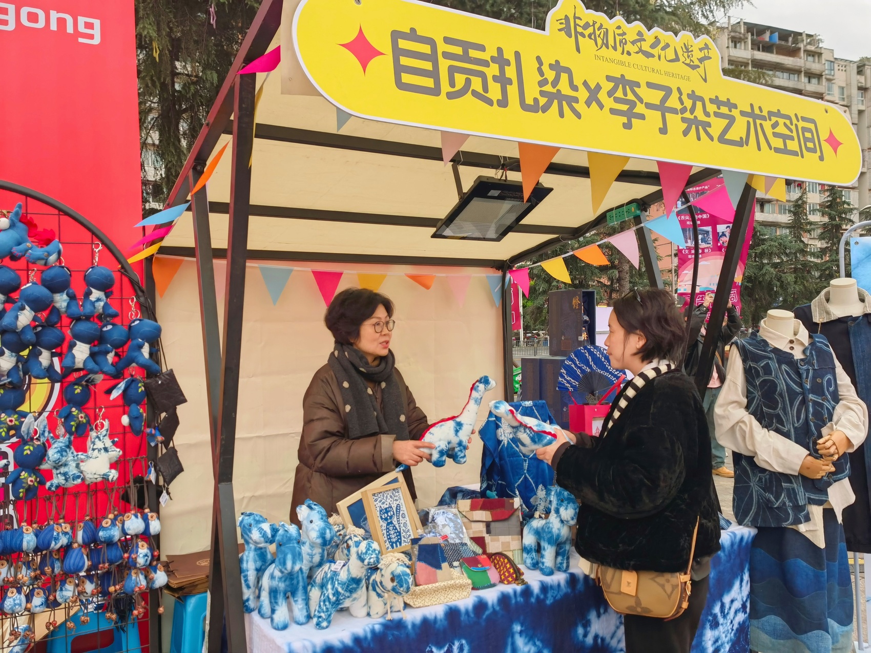 自贡市扎染技艺传承人李娟牵头打造的摊位吸引了不少人驻足。