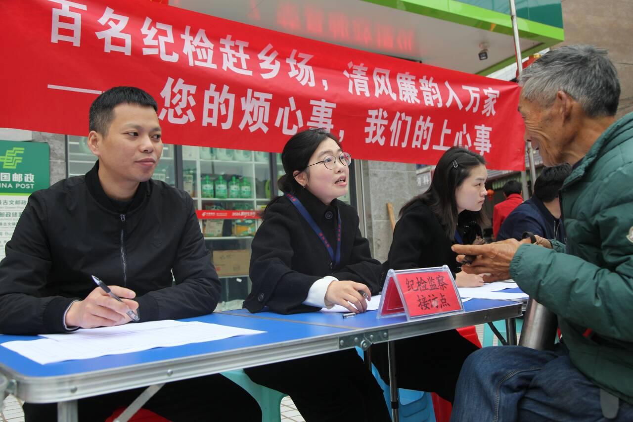 “老乡,您反映的山坪塘租金收入不明的问题,我们的同志会跟镇农业综合服务中心进行核实,今天就给您一个答复!”3月19日,在荣县古文镇古文场社区集市上一字排开新支起了一条长长的临时“摊位”,设有“流动接访点”标识的长桌面前,县纪委监委干部一边记录柏林坳村2组村民杨昌德的疑问,一边现场协调人员跟进核查。这是荣县纪委监委开展“百名纪检干部赶乡场、走人户”活动的第一站活动现场。
