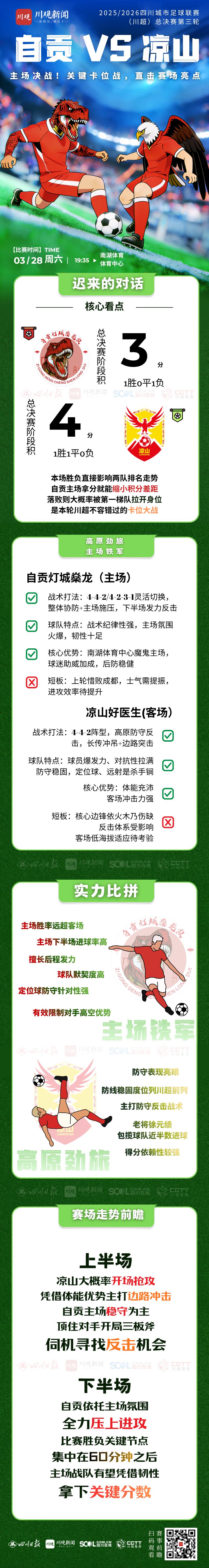 本场对决,是凉山稳健防守反击与自贡主场后程发力的直接碰撞,胜负走势大概率在下半场60分钟后逐渐明朗,究竟是高原劲旅客场勇夺积分,还是主场铁军势如破竹,值得球迷共同期待。