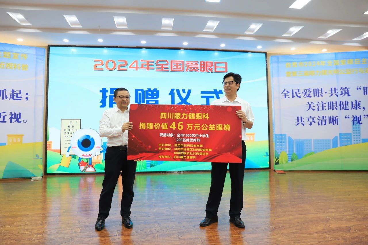 活动中,四川眼力健眼科向全市1000名中小学生和200名优秀教师捐赠价值46万元的公益眼镜。苏州艾尔兴公司向沿滩第二小学校捐赠价值38.4万元近视防控仪器用于建立爱眼小屋,希望通过科学的防控手段让更多孩子能够远离近视,拥有清晰舒适的视界。最后,眼力健眼科的老师们还为沿滩二小的部分同学进行近视科普抢答题及互动小游戏,让同学们更深入地体会视力健康的重要。
