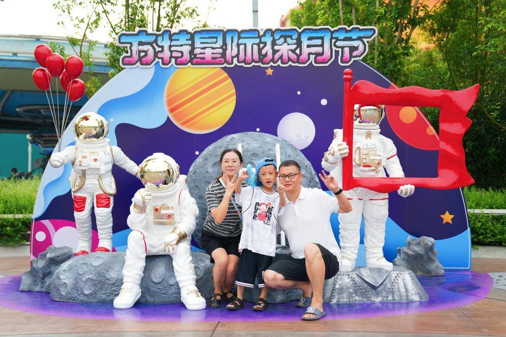 每天9点和18点,园区“遥望星空”打卡点猜灯谜赢奖品活动,吸引了不少游客热情参与。此外,本次打造的“登月计划”让众多游客圆了登上“月球”的心愿,游客们尽兴打卡,在此拍下中秋合家欢照片。