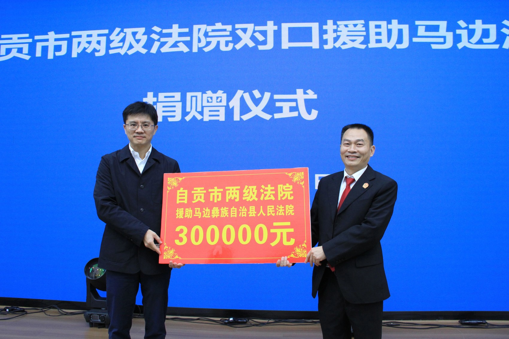 捐赠仪式上,曾学原院长代表自贡两级法院向对口援助的马边彝族自治县人民法院提供援助资金30万元。