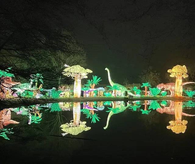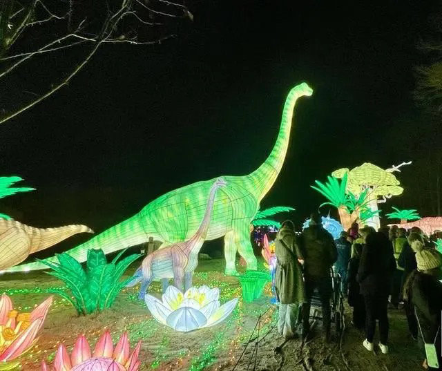 恐龙、狮子、蝴蝶、鲜花……“中国彩灯节”将该动物园的特质与自贡彩灯独有的艺术表现形式相融合,各式彩灯造型栩栩如生,仿佛将人们带入奇幻森林,吸引来不少观众。