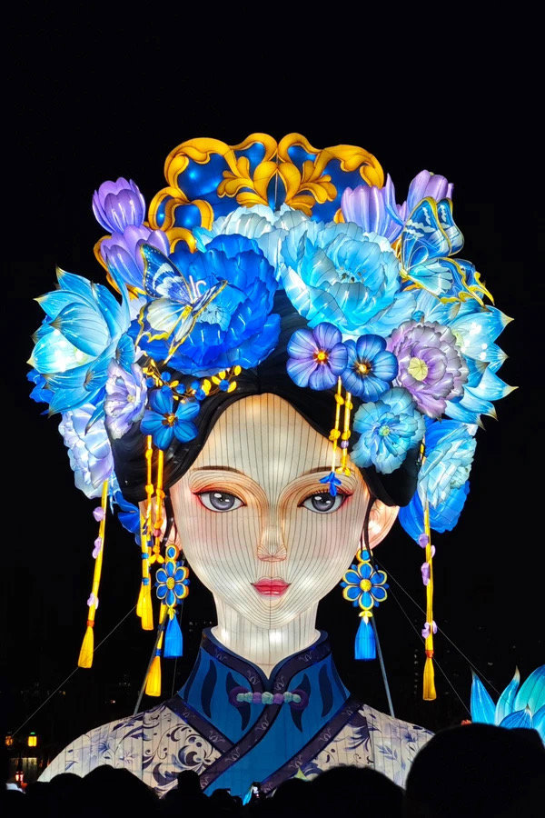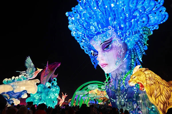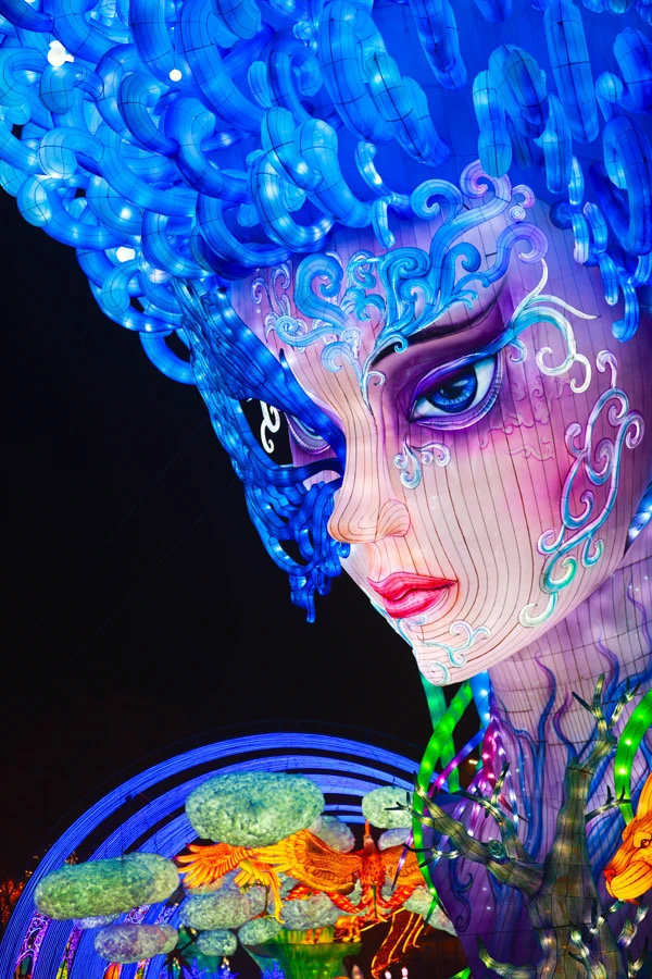 此次获奖的“精卫女神”以《山海经》中“精卫填海”的典故为设计灵感,高22米,“女神”一头海藻般的蓝色秀发,深紫色眼影下眸子低垂,令人过目不忘。此外,灯组结合最新的人像采集技术,通过“女神”的双眸捕捉现场画面,实时直播“女神”眼中的游客万象,创造性地实现了“彩灯+文化+科技”的多元结合。在第28届自贡灯会中,“精卫女神”以独具匠心的创意设计,精妙绝伦的制作工艺,一亮相就在全网开启了“霸屏”模式,成为本届灯会当之无愧的“网红”灯组。