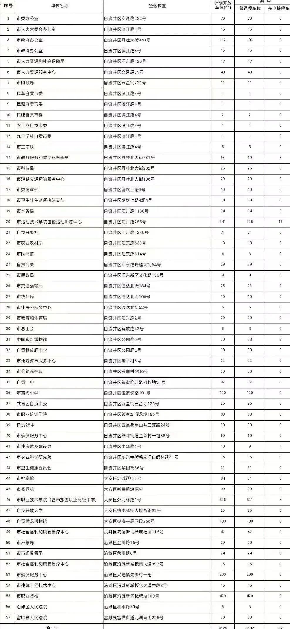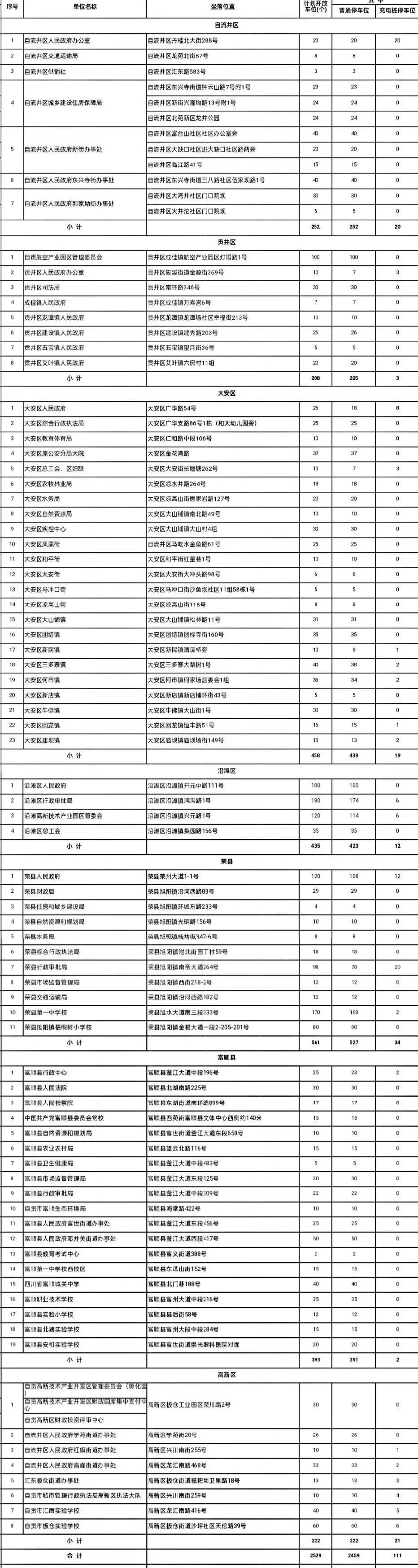 1月23日,记者从自贡市机关事务管理局获悉,春节期间,自贡将免费开放机关事业单位停车场137个,开放停车位5703个,方便市民错时“共享”。其中,市本级单位提供57个停车场、自流井区7个、贡井区8个、大安区23个、沿滩区4个、荣县11个、富顺县19个、高新区8个。