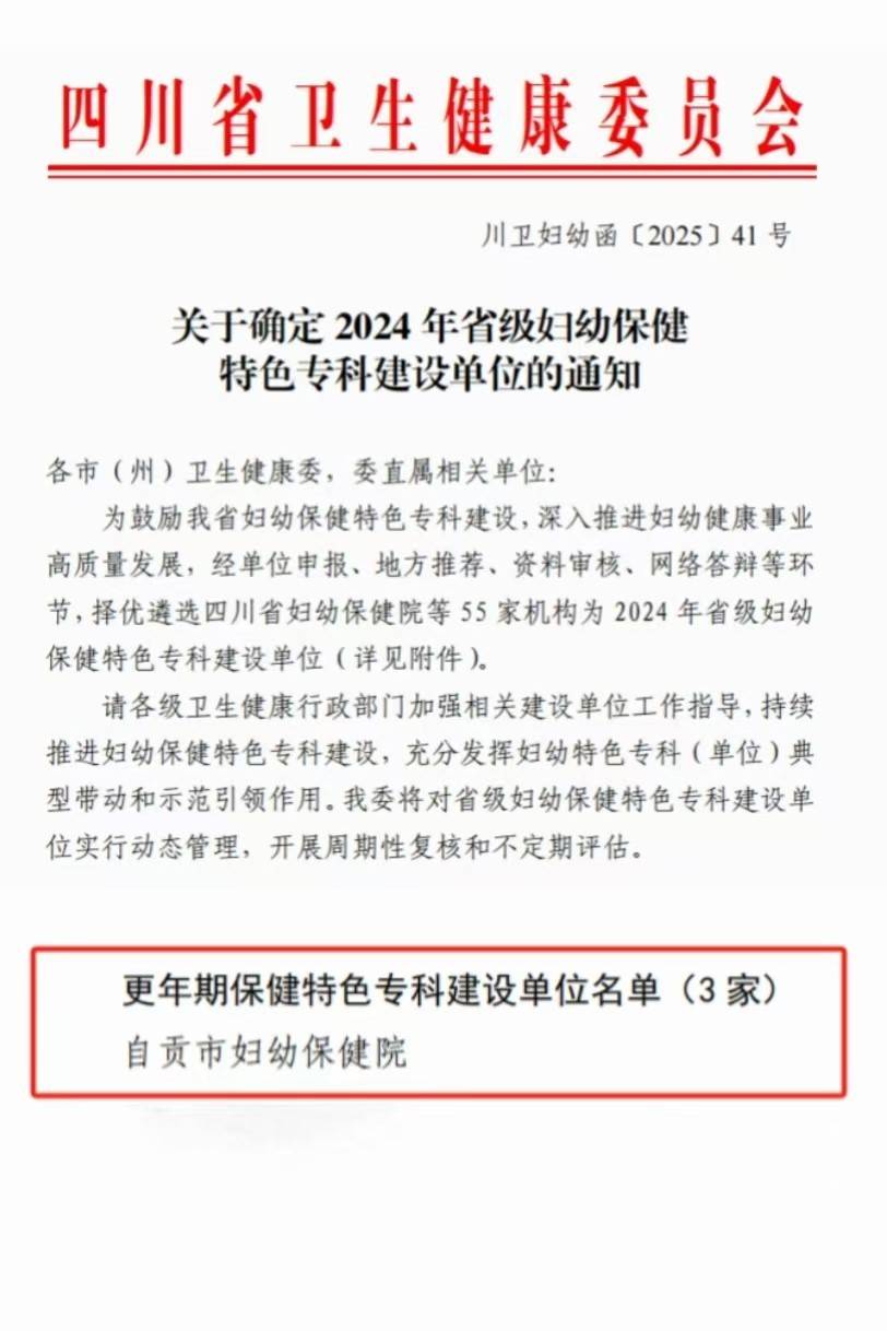 近日,四川省卫健委下发《关于确定2024年省级妇幼保健特色专科建设单位的通知》,自贡市妇幼保健院前期积极申报并通过集中答辩,获评为“省级更年期保健特色专科建设单位”。