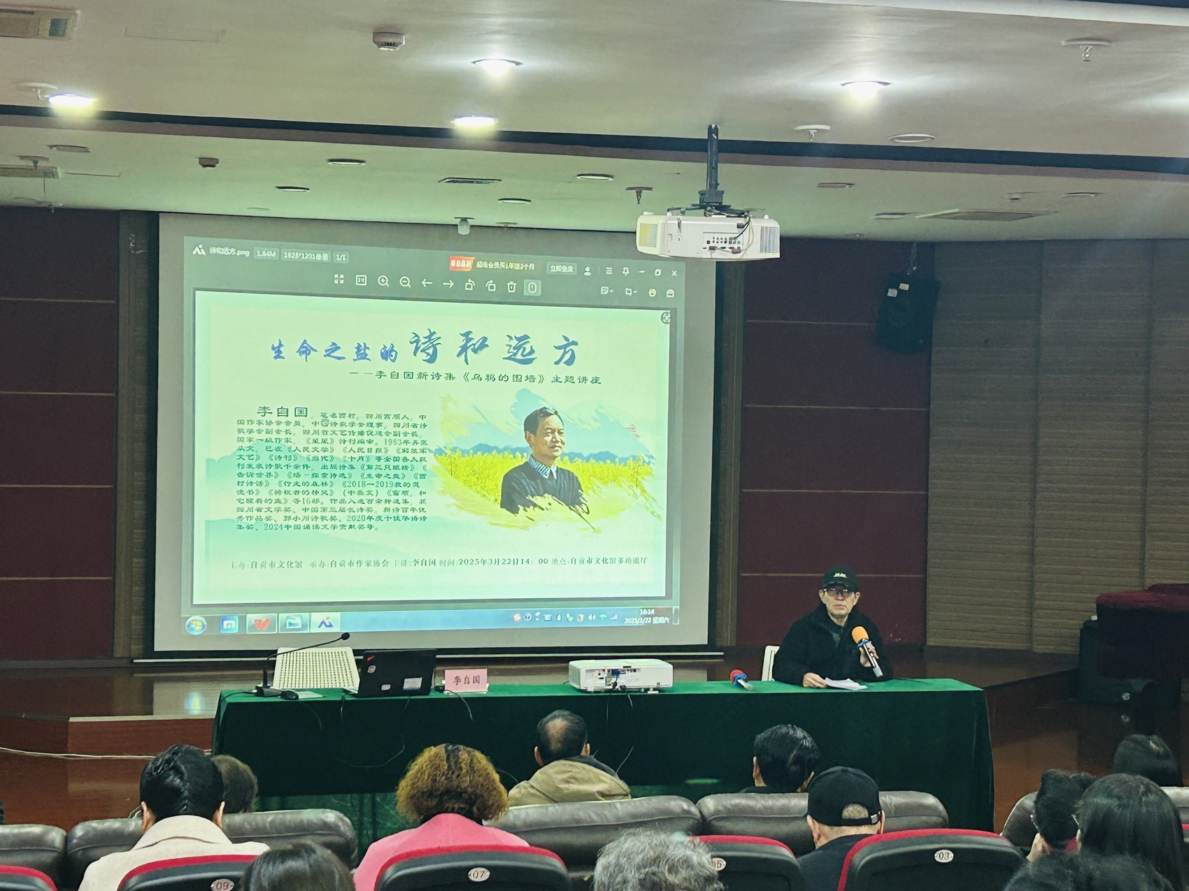 诗意寻根处,盐都共潮声。3月22日,由自贡市文化馆主办、市作家协会承办的“生命之盐的诗和远方——李自国新诗集《乌鸦的围墙》主题讲座”在自贡市文化馆举行。作为诗人李自国在家乡的首场文学活动,讲座吸引全市80余名诗歌爱好者参与,共同聆听这位从盐都走向全国的诗人对生命、故土与诗歌的深情诠释,见证诗歌艺术与精神远方的碰撞交融。