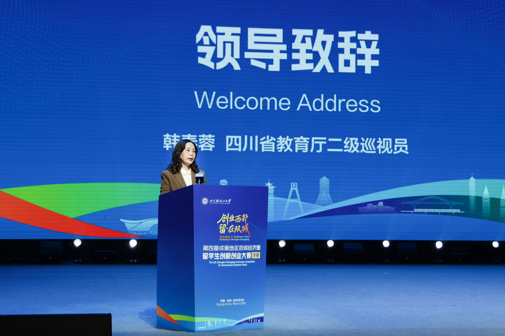 3月21日,“创业西部 留·在双城”——第四届成渝地区双城经济圈留学生创新创业大赛决赛在四川轻化工大学李白河校区开幕。来自川渝两地教育系统、人社系统的20支参赛团组共计100余名中外学生创客们齐聚盛会。四川省教育厅二级巡视员韩春蓉、四川省人力资源和社会保障厅二级巡视员周旭、四川轻化工大学校长庹先国出席大赛开幕式和颁奖仪式。重庆市教育委员会、重庆市人力资源和社会保障局、四川省教育厅相关处室负责同志,四川省专家服务中心负责同志参加颁奖仪式。