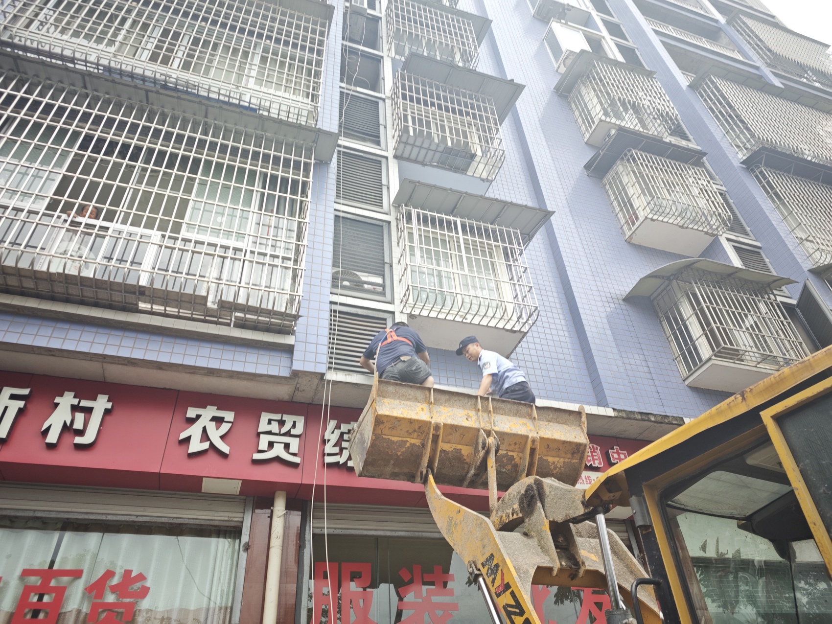 推土机轰鸣声启动,张维彬和热心群众一同坐进前面的“斗”中,到达二楼的层板,张维彬在群众的帮助下翻进防护栏,进入屋内找到女童,最终在警民携手救助下将3岁女童平安救出。