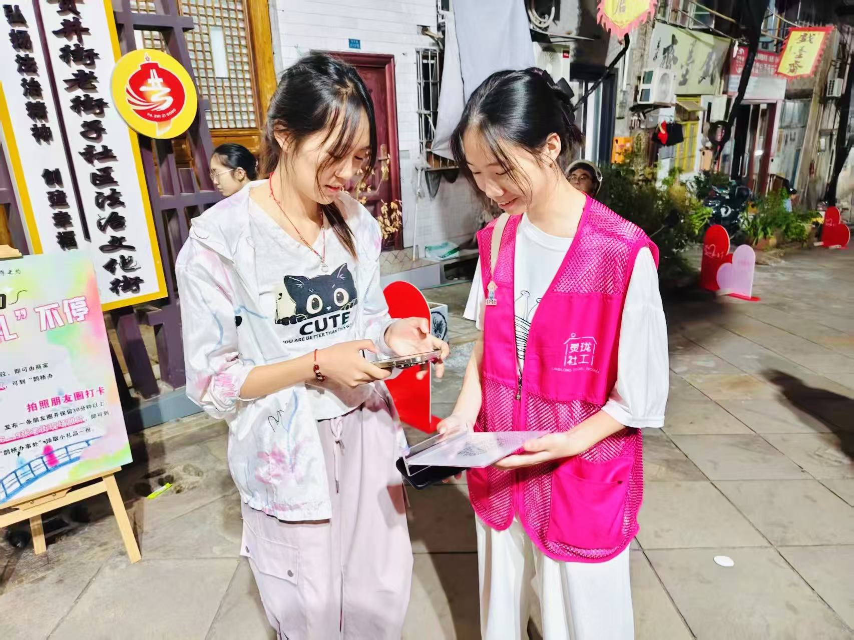 市集现场,幸福铺子内“福伴伴”邻里照料志愿者用老街幸福积分兑换服务;幸福染坊前,年轻人驻足挑选扎染T恤;湖广庙内,夏日音乐会欢快热烈。市集特别设置“随手捐”募捐海报和公益游戏区,游客可通过投壶、套圈等趣味游戏,以低偿参与的方式进行慈善捐赠,让公益融入游玩体验。