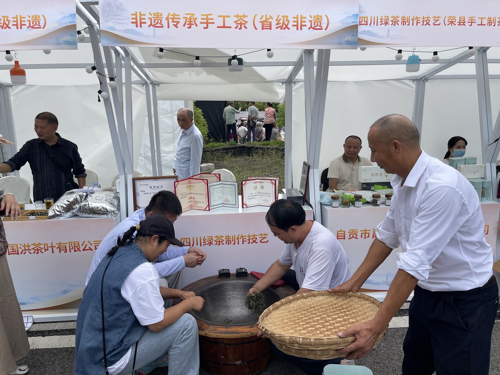 在非遗文创市集的文创产品区内,以吴玉章精神、荣县大佛为灵感设计的文创物件引人驻足;互动体验区中,游客在老师指导下亲手制作个性化纪念品;非遗传承区则集中展示了土陶制作、炒青茶艺等技艺。从成都返乡的大学生王薇在体验炒青后感慨:“双手被烫得发红,才真正体会到每一片茶叶的来之不易。”