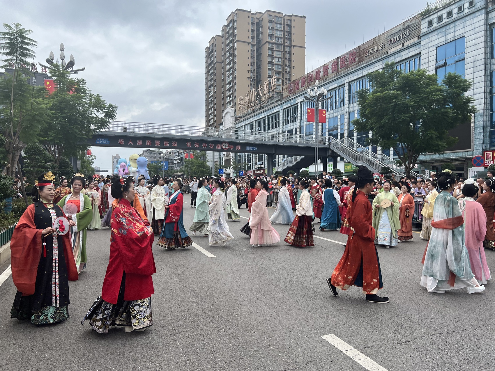 巡游尾声,“群众方阵”压轴出场,尽显富顺人文风采。数十位汉服同袍衣袂飘飘,身着汉、唐、宋、明等朝代华服,沿路展现华夏礼仪之邦的服饰之美。40位本土武术少年则步伐整齐,吼声震天,在指定地点献上刚劲有力的武术表演,完美诠释了富顺“崇文尚武、文武兼修”的千年风骨。