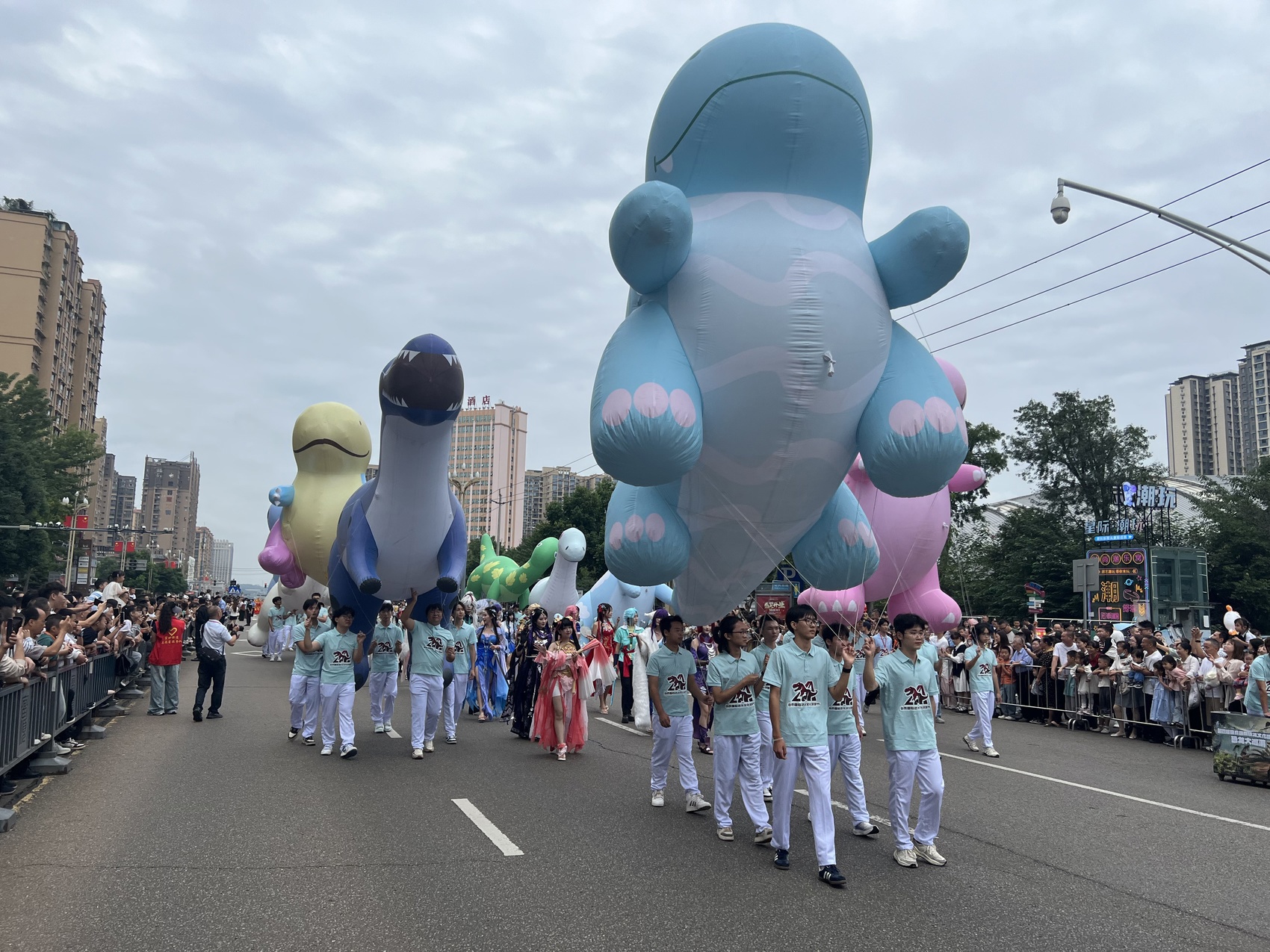 紧随其后的“气模方阵”带来了别样趣味。“自贡恐龙十三太保”阵容震撼,永川龙、沱江龙等超大气模造型憨萌,在操作员操控下活灵活现。它们与身着动漫、科幻服饰的Coser们趣味互动,完成了一场“远古IP”与“次元潮流”的破壁碰撞,充分彰显“惊奇自贡”的年轻活力。