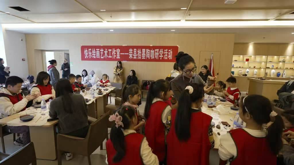 与此同时,荣县美术馆拾墨陶咖、铁厂镇1954紫陶园、土陶创意园等多个陶艺研学点同步开启创意之旅。自贡快乐绘画工作室的小朋友们在这里捏塑陶土、勾勒线条,将奇思妙想融入陶艺书签、桌面摆件等文创作品;来自富顺、宜宾等地的研学团队走进陶艺展厅与生产车间,近距离观赏精美陶器与老窑炉,在专业老师指导下完成彩绘陶盘、土陶冰箱贴制作,部分学生还在西部陶都艺术馆内对着心仪的土陶艺术品创作线描画,深度感受“西部陶都”的文化底蕴。