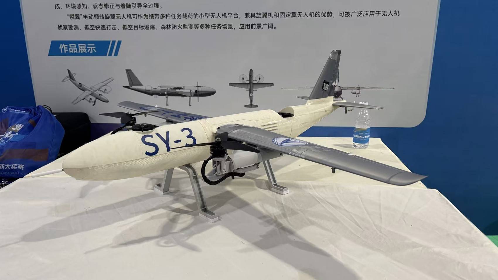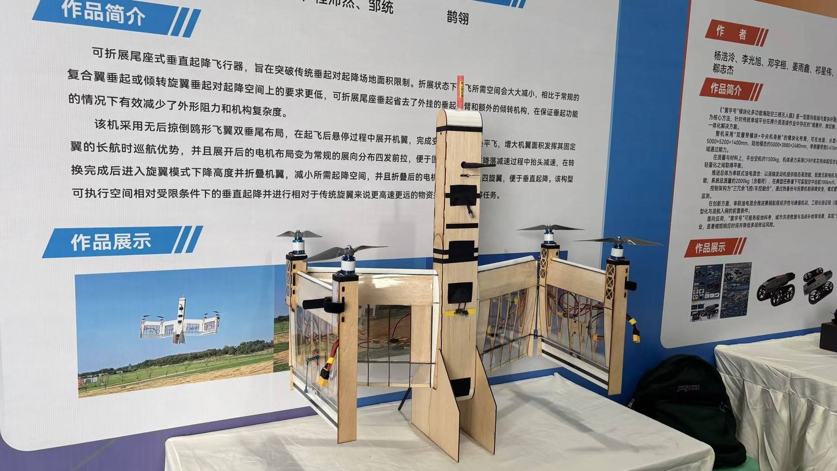 当天,数个高校、公司的参赛飞行器在现场展出。模块化多功能海陆空三栖无人器、倾转旋翼无人机、自转旋翼垂直起降飞行器、联结翼尾座式垂起无人飞行器……现场展出的飞行器,形状大小不一,功能各异,制作材料也各不相同。有些选手采用3D打印材料制作机身,达到抗压减重的目的;有些选手用泡沫等材料使机身机翼融为一体、增强抗风能力;有些选手则用木板等材料制作出了“可折展尾座”,有效减少外形阻力。