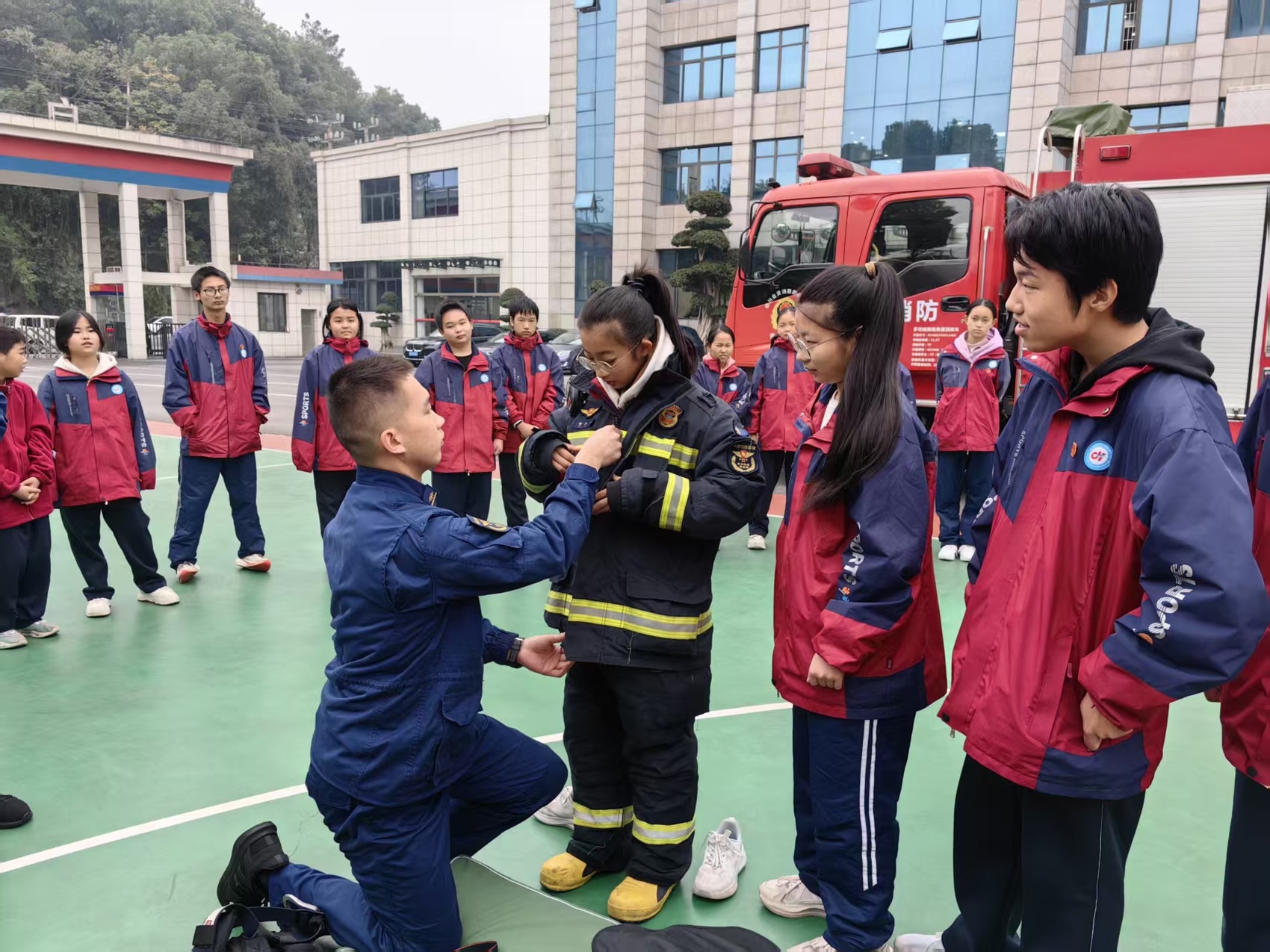 活动中,该县消防救援大队的指战员们向同学们详细介绍、现场展示液压破拆工具组、空气呼吸器等专业装备的主要作用和操作方法。通过认真听讲与积极互动,同学们对各类消防救援器材有了更加深入的认识。在实践体验环节,同学们在消防员的专业指导下试穿厚重的灭火防护服,并亲自操作消防水枪,切身感受消防员所承担的使命与责任。