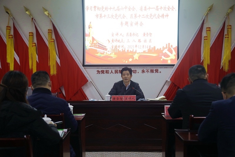 12月14日下午,自流井区委书记黄雪智到其党支部工作联系点东兴寺街三八路社区开展十九届六中全会、省委十一届十次全会、市第十三次党代会、区第十二次党代会精神宣讲。
