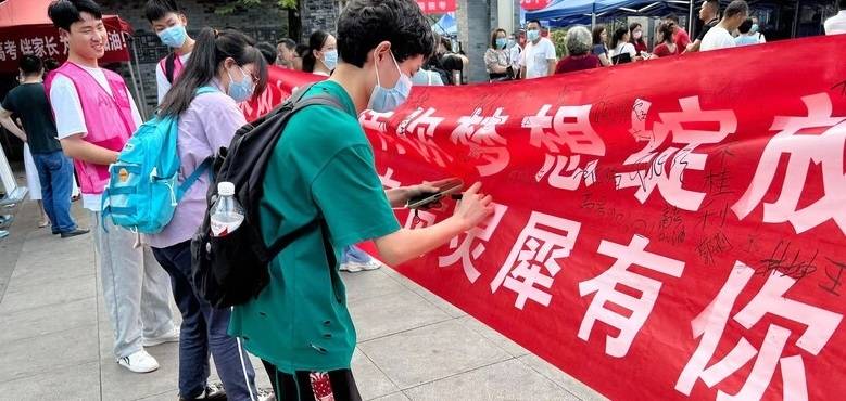 十年寒窗苦读,一朝金榜题名。自贡市蜀光中学门口,家长和老师们通过各种方式为考生们加油鼓劲。老师们组成送考“啦啦队”,高举“应援牌”,一句句轻快活泼的口号,满怀祝福和期望。