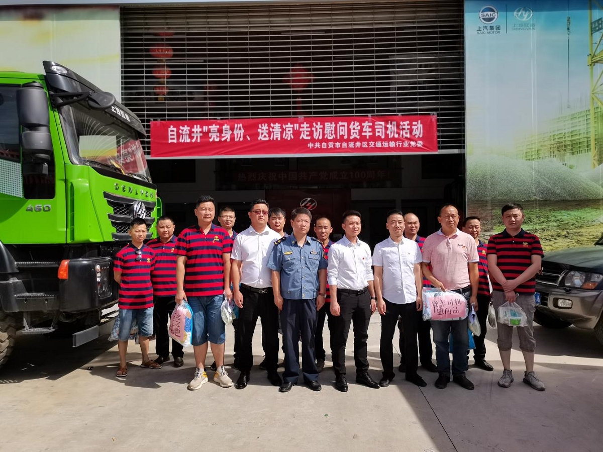 自流井区“两新”党工委、自流井区交通运输行业党委慰问人员与货车司机面对面交谈,了解他们的工作、生活状况,叮嘱他们注意防暑降温、规范操作,切忌疲劳驾驶,并为10余名货车司机发放薄凉被、口罩、清凉药等慰问品。